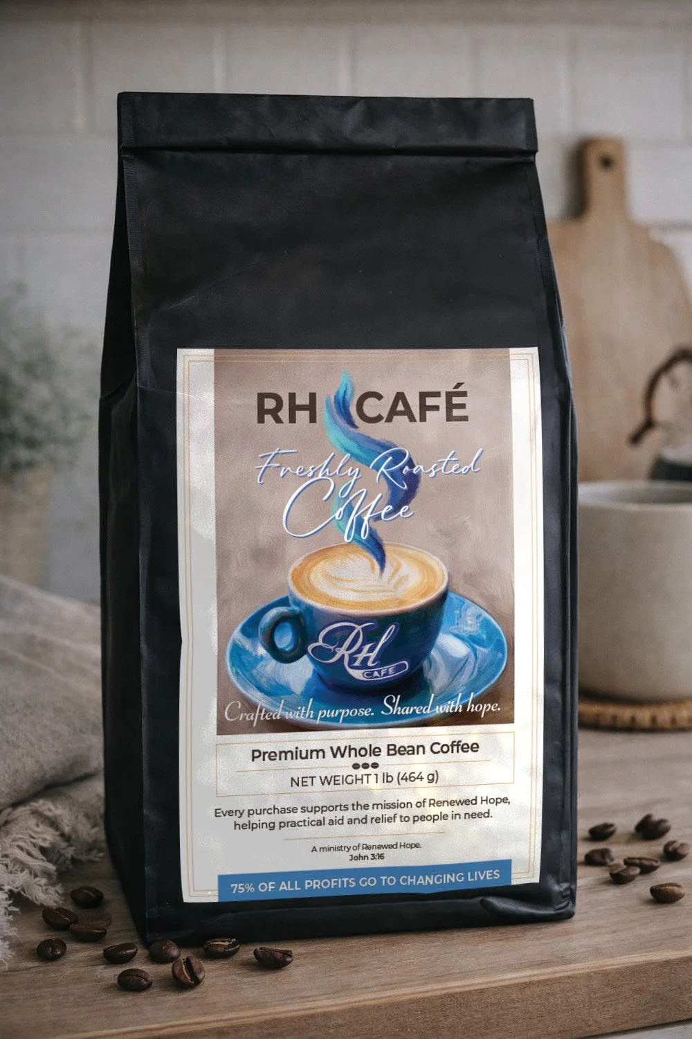 Freshly Roasted. Purposefully Packaged. Savor the Renewed Hope blend in your own kitchen. Our signature coffee beans are roasted to perfection and available for purchase in-store. Featuring our custom-designed packaging, it’s the perfect gift for a fellow coffee lover—or a daily reminder of the hope you are helping to provide.